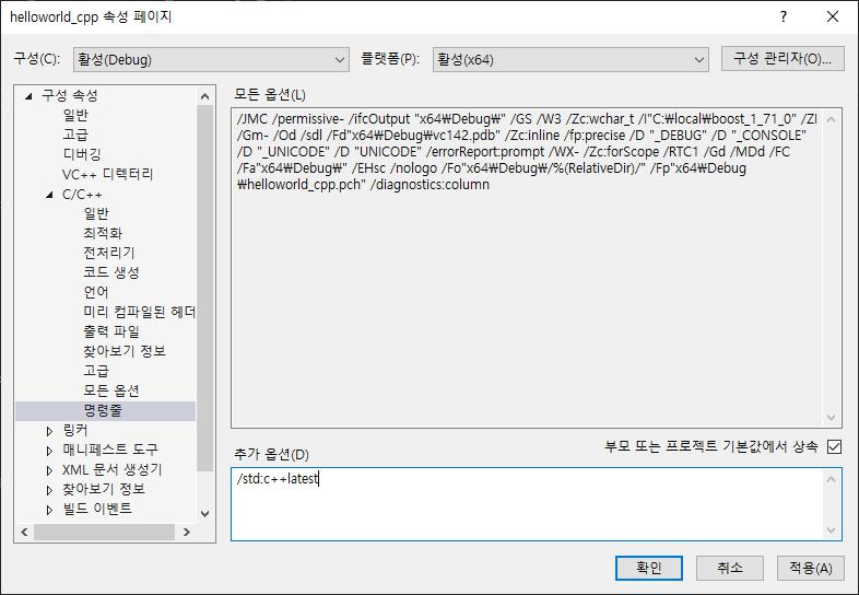 2. '프로젝트 속성 > C/C++ > 명령줄'에 /std:c++latest 추가
