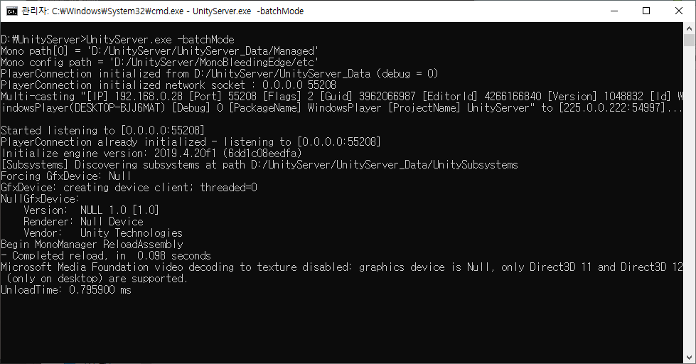 NOTE - 만일 Server Build 옵션을 활성화 시킨 상태로 빌드를 하였다면 "-batchMode" 커맨드 라인 옵션을 사용하지 않아도 헤드리스 모드로 동작하기 때문에 단순히 UnityServer.exe만 실행 해도 된다.