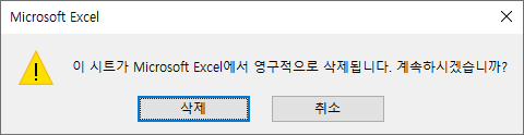 워크시트가 삭제 될때 엑셀은 아래와 같은 메시지창을 띄우며 삭제 여부를 확인합니다.