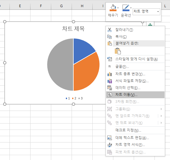 - 차트의 여백 부분을 우클릭 하여 메뉴가 뜨면 '차트 이동'을 선택 합니다.