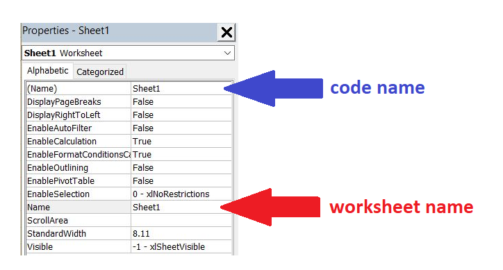 워크시트에 접근하는 가장 좋은 방법은 '코드 네임'을 이용하는 것입니다. 모든 워크시트는 각각의 '코드 네임'과 '워크시트 네임'을 가지고 있습니다. 워크시트 네임은 엑셀의 워크시트 탭에 보여지는 이름입니다.