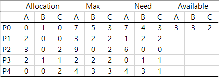 예를 들어 P0의 경우, 현재 각각의 자원 A:0, B:1, C:0 를 할당 받았고 작업을 완료하기 위해 A:7, B:4, C:3의 추가자원이 더 필요하다. 하지만 현재 시스템상에서 가용자원은 A:3, B:3, C:2 밖에 없으므로 P0은 당장 작업을 완료 할 수 없는 상태다.