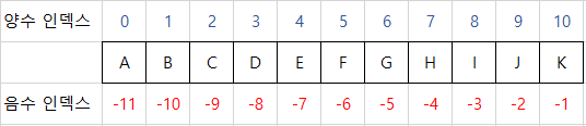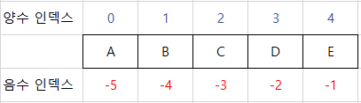 양수 인덱싱은 일반적으로 우리가 배열을 사용하는 것과 동일하게 0을 기본으로하여 왼쪽에서 오른쪽으로 증가한다. 반면 음수 인덱싱은 -1을 기본으로 오른쪽에서 왼쪽으로 감소한다.