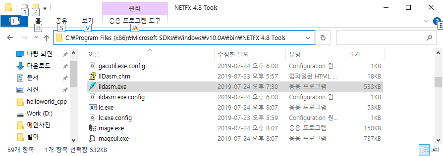 C:\Program Files (x86)\Microsoft SDKs\Windows\v10.0A\bin\NETFX 4.8 Tools 에서 ildasm.exe를 실행한다.