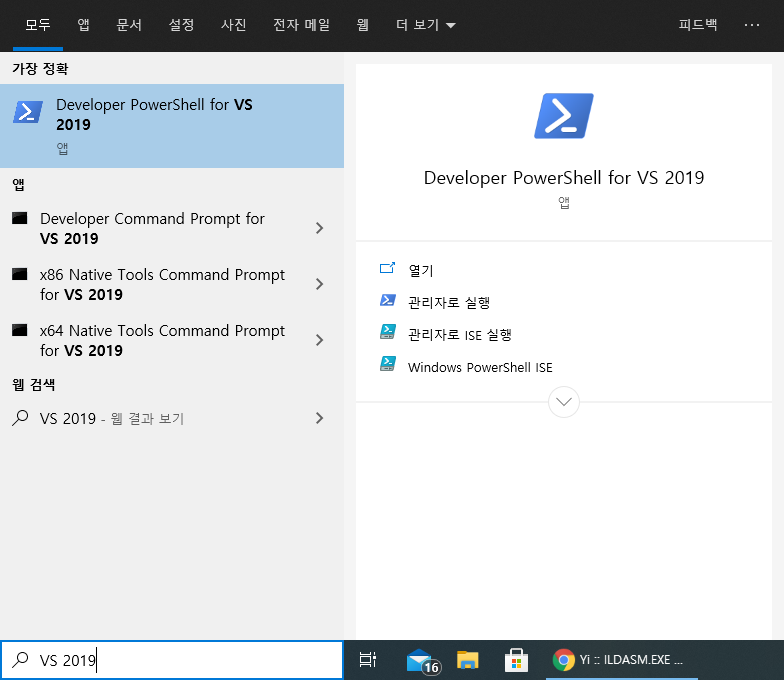 시작 메뉴의 검색 창에서 "Developer PowerShell for VS 2019"를 검색한다. 간단하게 "VS 2019"만 검색해도 충분하다.