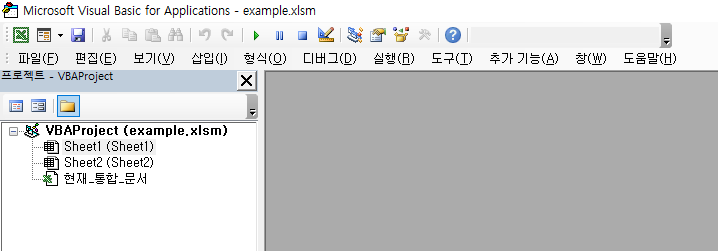 코드를 작성할 문서를 선택합니다. 통합문서의 이름은 "VBAProject" 옆의 괄호에서 확인할 수 있습니다. 현재 열려있는 통합문서들은 모두 VBAProject 윈도우에 아래와 같이 보여집니다.