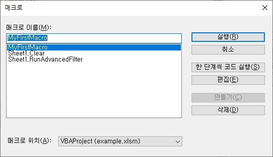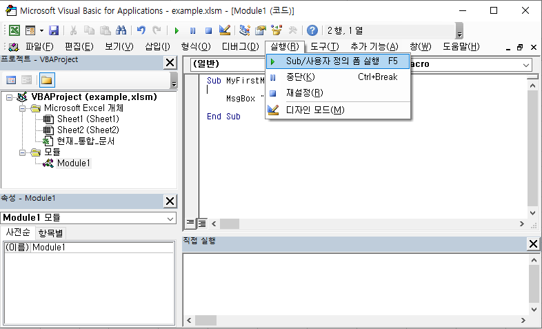 커서를 매크로 Sub 내부에 놓고 "실행 > Sub/사용자 정의 폼 실행"을 선택합니다. 단축키는 F5입니다.