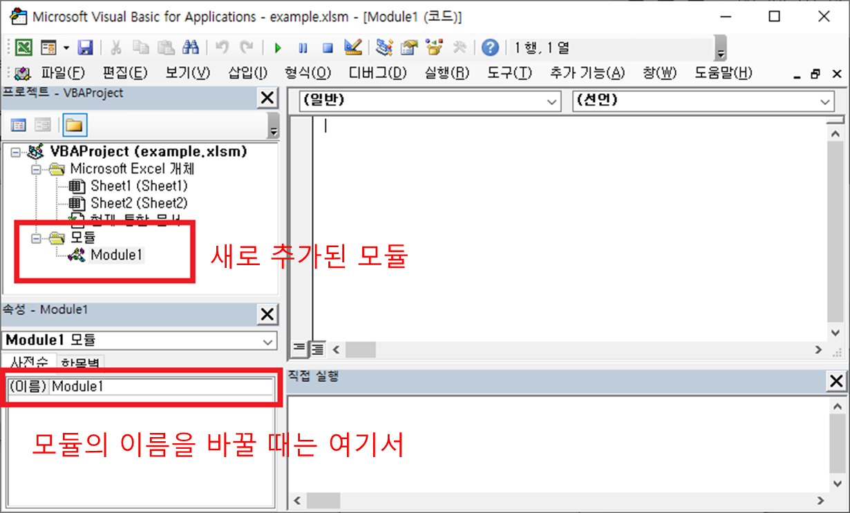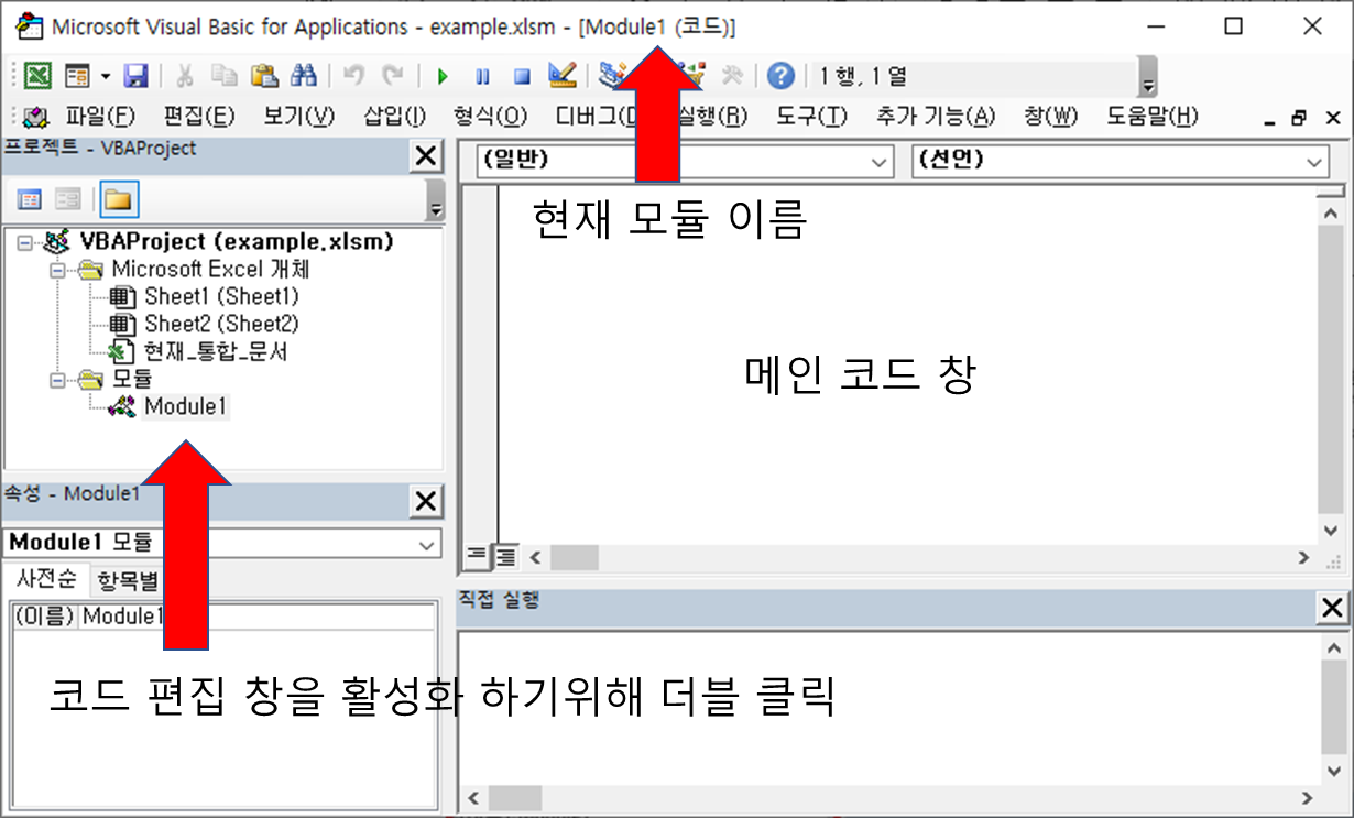 VBA 프로젝트 창에서 모듈을 두 번 클릭하면 해당 모듈의 코드를 작성할 수 있는 빈 창이 메인 코드 창에 표시됩니다. ("Option Explicit"옵션이 켜져 있는 경우 "Option Explicit" 텍스트가 포함될 수 있음)