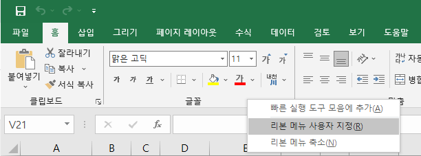 1. 리본 메뉴의 빈 공간을 마우스 오른쪽 클릭합니다. 그럼 아래와 같이 표시되는 목록에서 "리본 메뉴 사용자 지정(R)"을 선택 합니다.