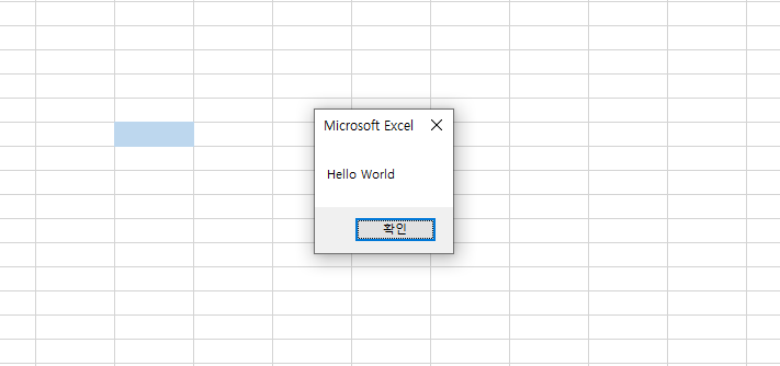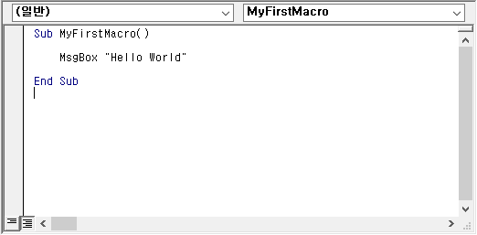 MsgBox "Hello World" 를 타이핑 합니다. 그러면 매크로 실행시 사용자에게 "Hello World"가 출력되는 대화 상자가 나타납니다.