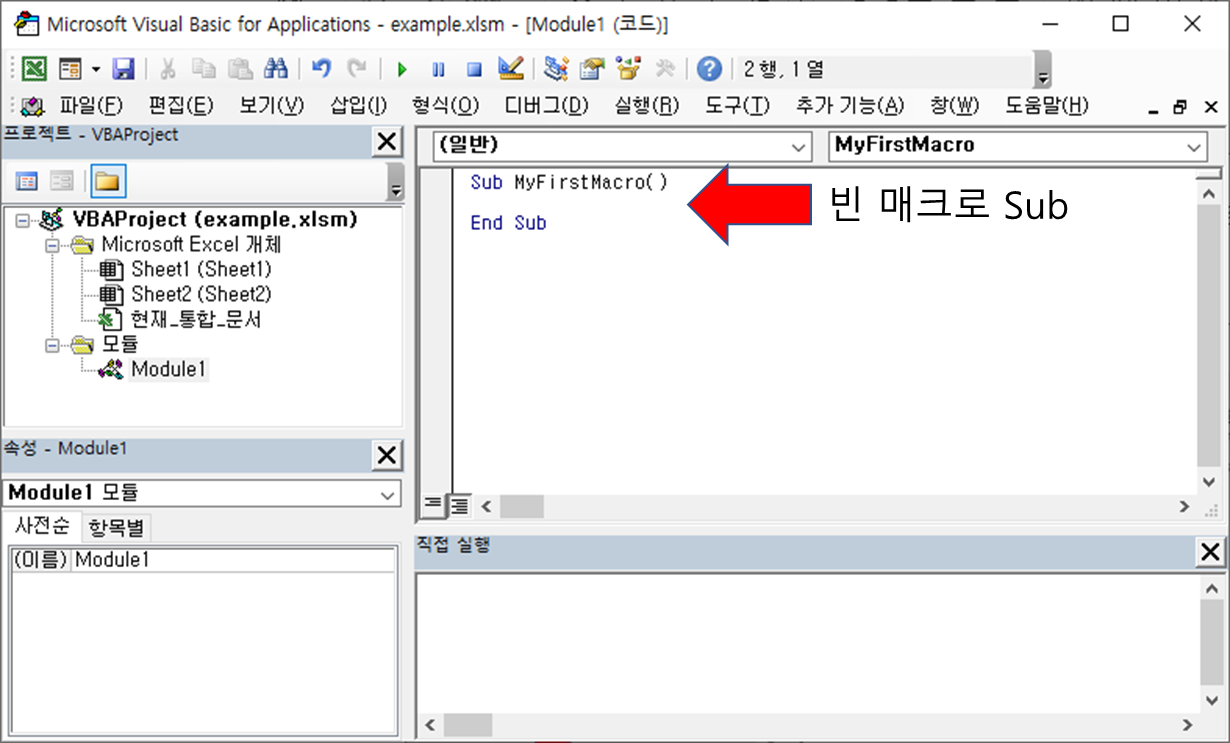 다음 섹션에서는 가장 기초 부터 매크로를 만들 것입니다. 매크로란 Sub 를 의미합니다(sub가 무엇인지는 뒤에 차차로 설명 됩니다).