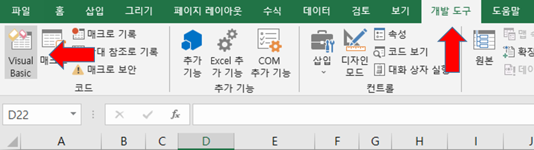 비주얼 베이직 편집기를 시작하려면 리본 메뉴의 "개발 도구"탭에서 "Visual Basic" 아이콘을 클릭합니다. 단축키는 Alt+F11을 이용할 수 있습니다.
