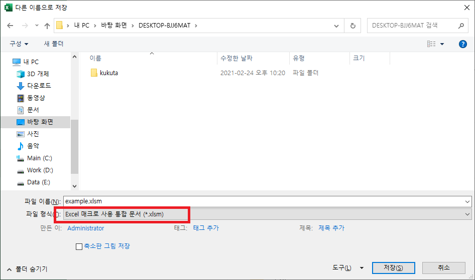 Excel 통합문서를 만들게 되면 기본확장자 .xlsx로 저장됩니다. 하지만 통합문서에 매크로가 있는 경우 매크로 사용 통합 문서로 저장해야 합니다. 저장하다 코드를 날려버릴것을 방지하기 위해 처음 부터 이 작업을 하는 편이 좋습니다.