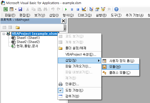 코드를 작성할 문서를 마우스 오른쪽 버튼으로 클릭하고 "삽입 > 모듈"을 선택합니다.