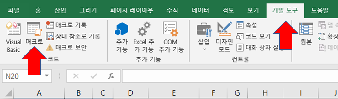 '개발 도구'탭은 Excel 매크로에 관련된 메뉴들을 담고 있습니다. 하지만 기본적으로 리본 메뉴에서 보이지 않으므로, 여러분의 Excel에서 '개발 도구'탭을 찾을 수 없다면 다음 단계를 통해 메뉴에서 활성화 시킬 수 있습니다. 만일 "개발 도구"탭이 보인다면 이번 섹션을 건너 뛰어도 됩니다.