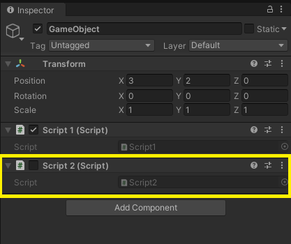 그리고 위 스크립트와 연결된 게임 오브젝트의 인스펙터를 살펴 보자. 노란색 박스를 보면 Script2의 경우는 비활성화 되어 있는것을 확인할 수 있다.