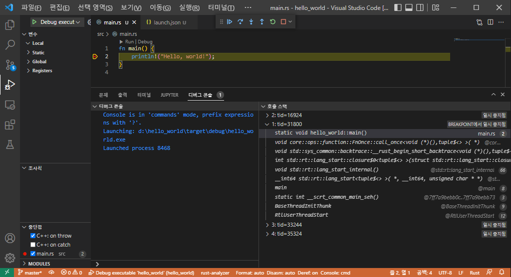 지금 주목해야 할 부분은 src/main.rs 파일이 자동으로 생성 되었고 2라인에 F9 단축키를 이용하여 브레이크 포인트를 걸었다는 것이다.