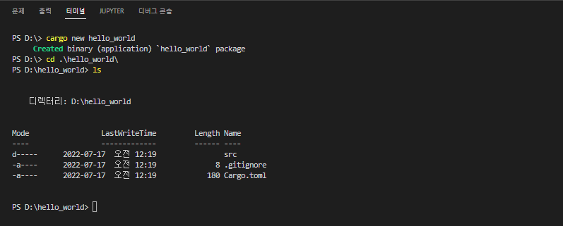 cargo가 무엇인지 뒤 따르는 인자들이 무엇인지에 대한 설명은 본격적으로 러스트 프로그래밍을 다루는 포스트에서 다룰 예정이다. 이번 포스트는 IDE 구죽과 사용에 관련된 내용이므로 러스트에 관한 궁금증은 잠시 미뤄두도록 하자.