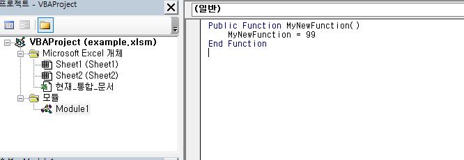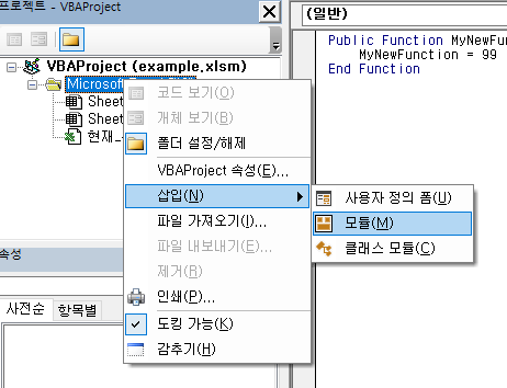 여러분이 엑셀에서 제공하는 기본 함수 외에도 여러분의 커스텀 Function 프로시져를 만들어 엑셀 시트에서 사용할 수 있습니다. 시트에서 사용할 수 있는 커스텀 함수는 모듈을 새로 만들어 public 함수를 추가해주면 됩니다.