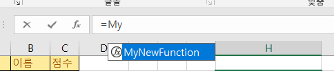 위와 같이 작성후 엑셀의 함수 박스에 "=My"라고 검색하면 아래 스크린샷 처럼 함수 목록이 뜨는것을 확인할 수 있습니다.