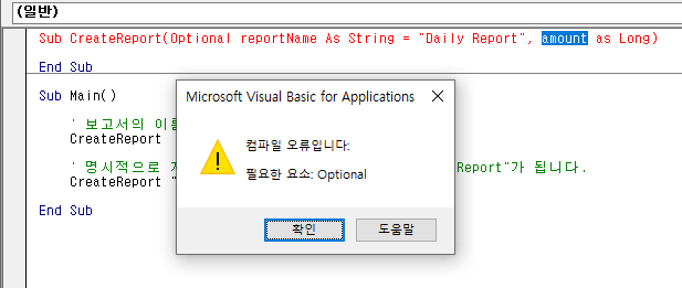 Optional 매개변수는 매개변수 리스트의 뒤쪽에 위치해야 합니다. 만일 일반 매개변수 앞에 선택적 매개변수를 선언하면 에러가 발생합니다.