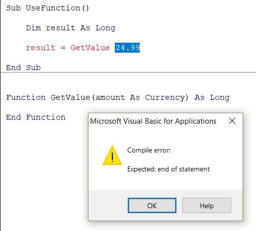 - 값을 반환하지 않을 때 Sub/Function의 매개변수에 괄호를 사용하지 마세요.