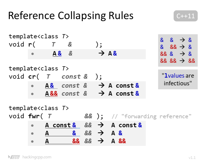 이렇게 타입 추론을 통해 참조를 가리키는 참조 타입이 발생하게 되면 C++은 "reference collapsing"이라는 규칙에 따라 최종 타입을 결정한다.